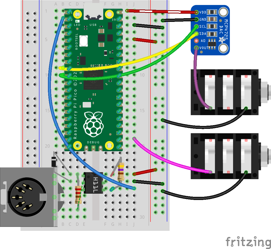 I’ve been toying with the idea of building a MIDI to CV converter for at least a decade. Now I’ve finally had a go using MicroPython on the Raspberry Pi Pico.
