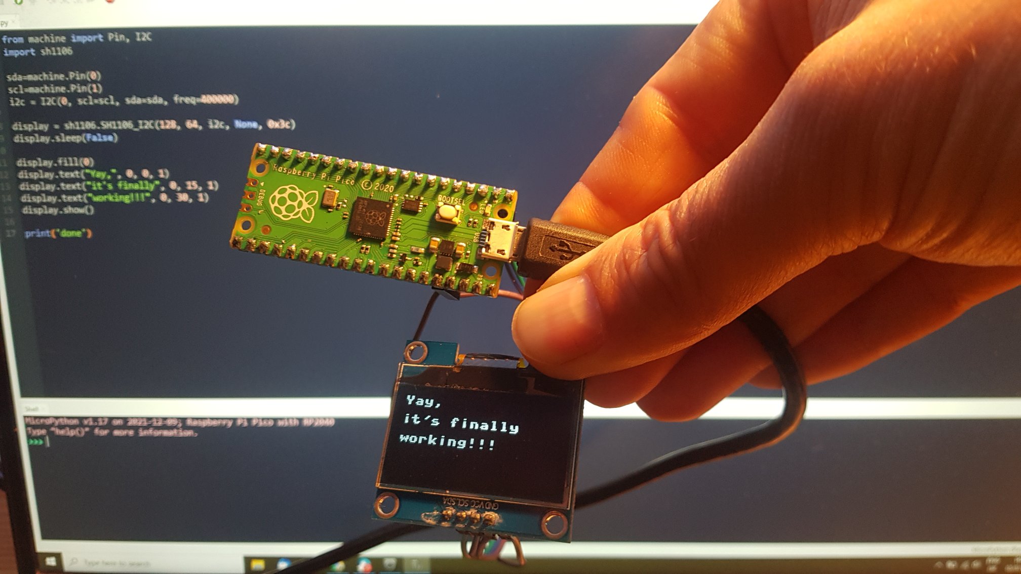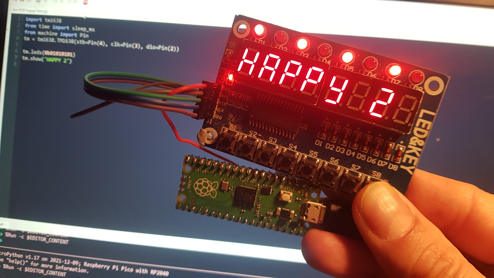 Displays on the Raspberry Pi Pico AxWax 10 Jan, 2022 Electronics I spent longer than I care to admit on failing to get either a TM1638 LED, an SH1106 OLED or a 1602 LCD to work with my Pico. Turns out one of my jumper wires had an intermittent fault 🤦 After a wire transplant everyone is finally happy!